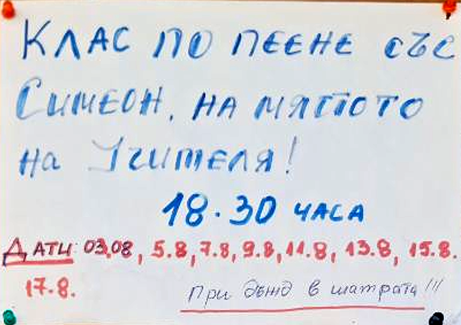 ![]() 16 ч. - Общо събраниие на участниците в ЛДШ - организационни въпроси - място на провеждане - шатрата. 18.30 ч. - Пеене със Симеон на Мястото на Учителя |