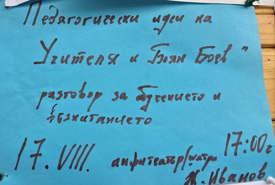 ![]() Педагогически идеи на Учителя и Боян Боев – ЛДШ Рила 2025 г. Разговор за обучението и възпитанието - лекция Иванов Дата: 17.08.2025 г. (събота) Място: Амфитеатъра - от 17:00 ч. |