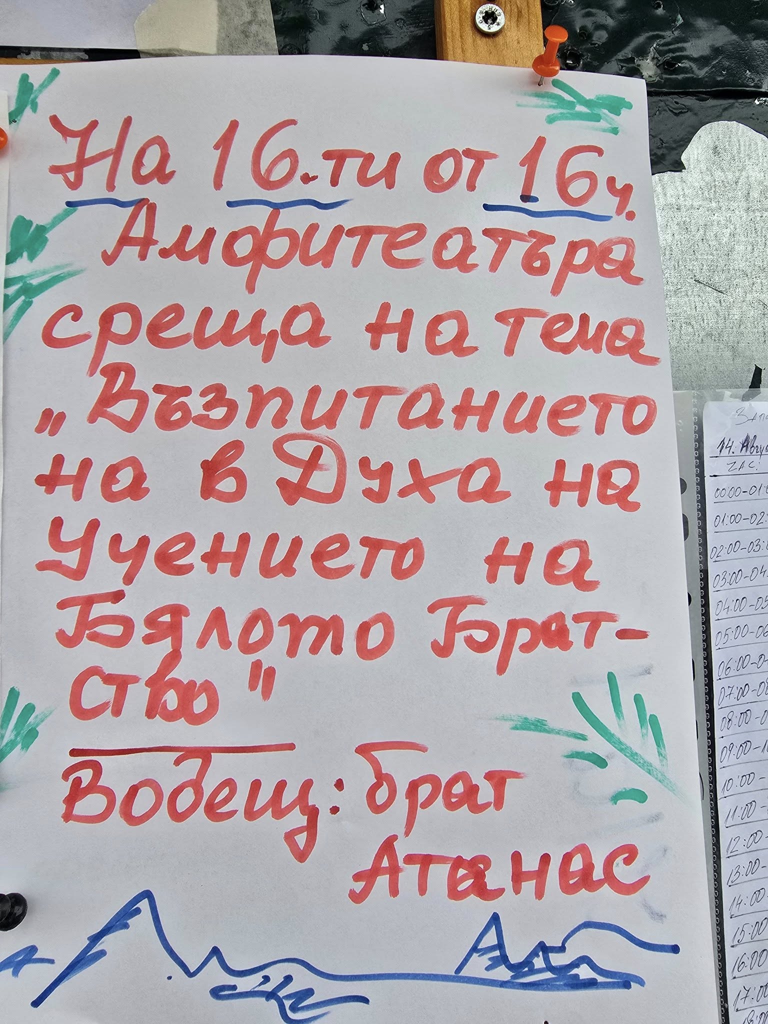 ![]() 05:30ч. Посрещане на Слънцето, Духовен наряд – същият който е и на Рила. 07:30ч. Паневритмия 09:00ч. Свободна програма 10:00ч. Лекция от предварително уговорен лектор 12:00ч. Свободно време – възможно е да се организира братски обяд, разходки в планината или почивка. 16:00ч. Четене на Беседа и/или други лектори по желание, музикални занимания. 20:00ч. Вечерен наряд Лектори […]