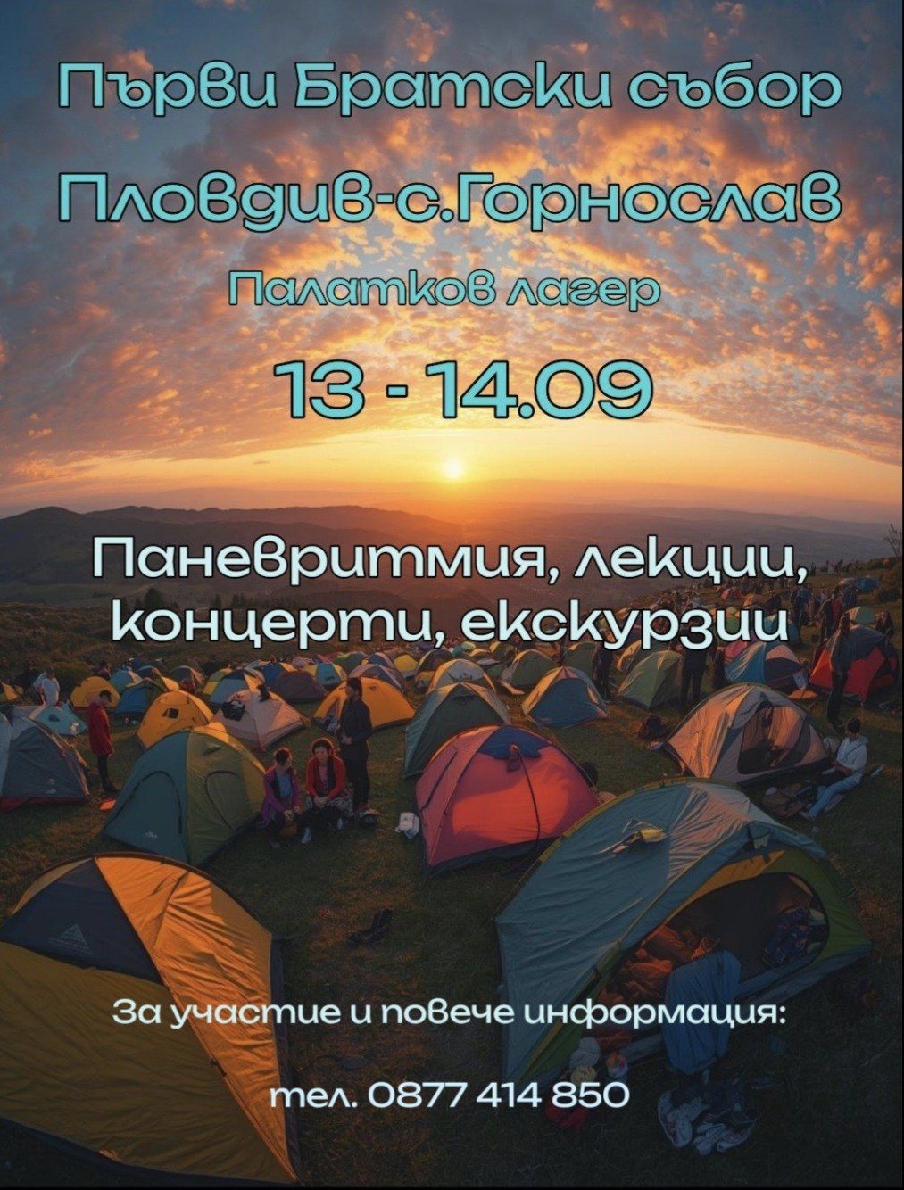 ![]() Братски събор в с. Добърско Да обединим мисълта си и да отправим молитва за запазване на мира, единение на народа ни и възраждане на човешкия дух. 13. и 14. септември 2025 г., "Изгревът на Любовта" с. Добърско Програма на събора 13.09.2025 г. (събота) 07:00 - Посрещане слънцето с духовен наряд, "Призвание към народа ми български, синове […] ![]() Палатков лагер 13-14 септември 2025 г. Паневритмия, лекции, концерти, екскурзии За участие и повече информация: тел. 0877 414 859 ![]() ПРОГРАМА на братска среща "ЧЕРВЕН-БОРОВО" 13-14.09.2025 г. 13.09.25 г., събота, Средновековна крепост с. Червен, Русенско. 07:00 ч. - посрещане на изгрева, наряд и беседа "Желаният мир", 28.08.1938 г., София 08:00 ч. - паневритмия 09:30 ч. - братска закуска 10:30 ч. - "Мирът и окултната музика " - лектор Ясен Даскалов Възможности за разходка до пещера […] |